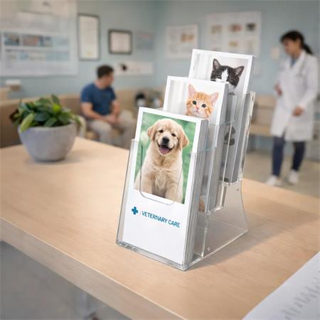Az 1/3 A4 méretű, asztalra és falra is helyezhető prospektustartó univerzális és praktikus megoldás többféle szóróanyag egyidejű kihelyezésére.